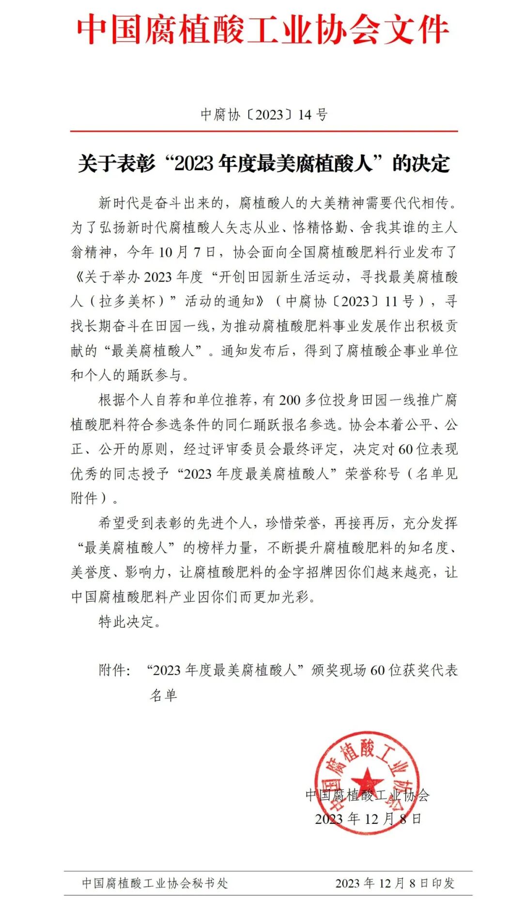 腐植酸肥料专委会新闻资讯站【编者按】12月8日,2023年度“开创田园新生活运动,寻找最美腐植酸人(拉多美杯)”颁奖典礼在广东湛江举行。协会会长韩立新女士宣读了《关于表彰“2023年度最美腐植酸”的决定》,会议现场为60位荣获“2023年度最美腐植酸人”的代表颁发了荣誉证书。山东农大肥业科技股份有限公司林荣培、肖官兴荣获表彰。希望受到表彰的先进个人,珍惜荣誉,再接再厉,充分发挥“最美腐植酸人”的榜样力量,不断提升腐植酸肥料的知名度、美誉度、影响力,让腐植酸肥料的金字招牌因你们越来越亮,让中国腐植酸肥料产业因你们而更加光彩。