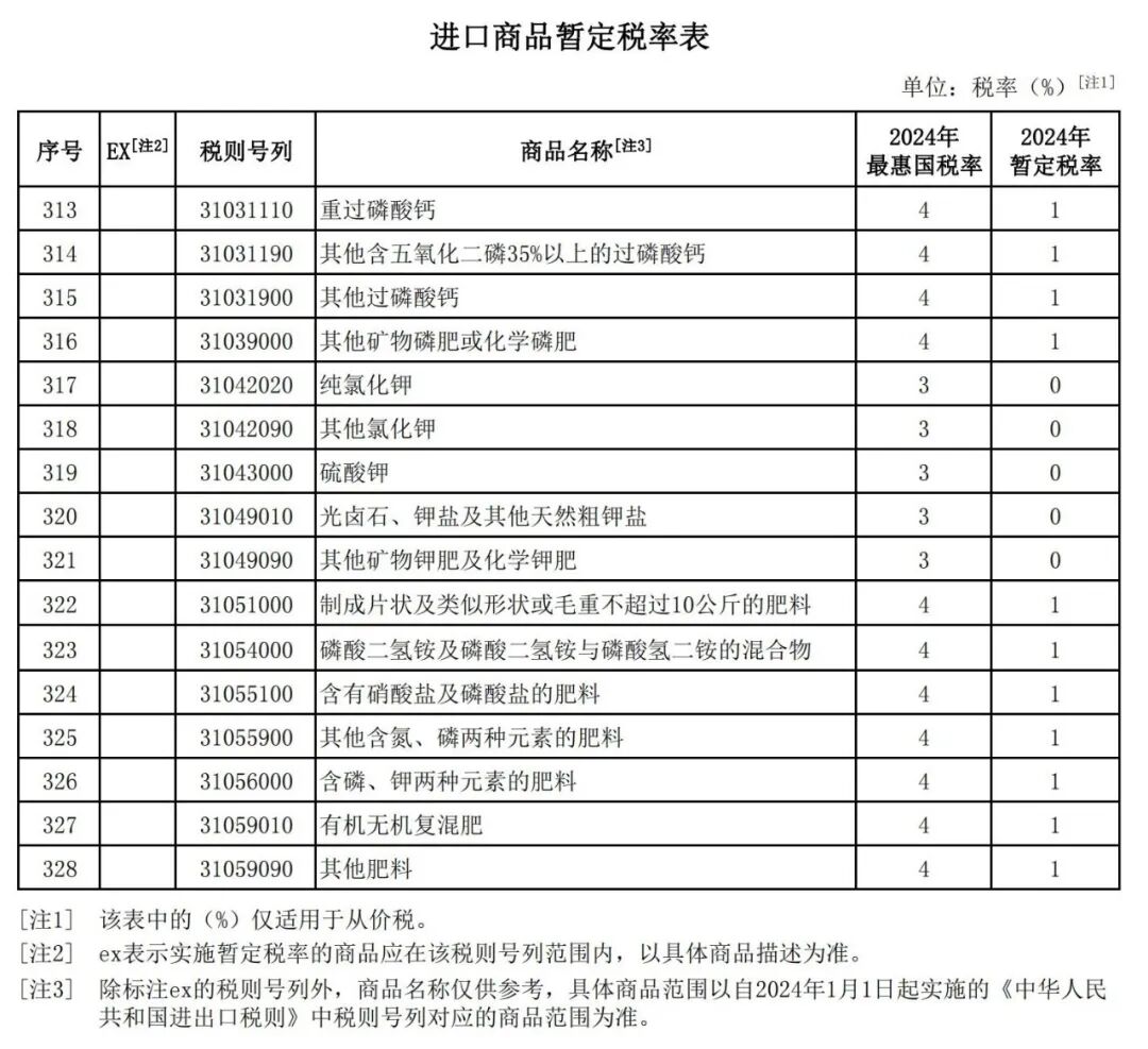 近日,财政部公布了《国务院关税税则委员会关于2024年关税调整方案的公告》(点击文末“阅读原文”),2024年1月1日起,对部分商品的进出口关税进行调整。根据《2024关税调整方案》,尿素、复合肥、磷酸氢铵3种化肥的配额税率继续实施1%的暂定税率,氯化钾、硫酸钾等钾肥进口继续执行“0”关税!“腐植酸+钾”时机大好!!!