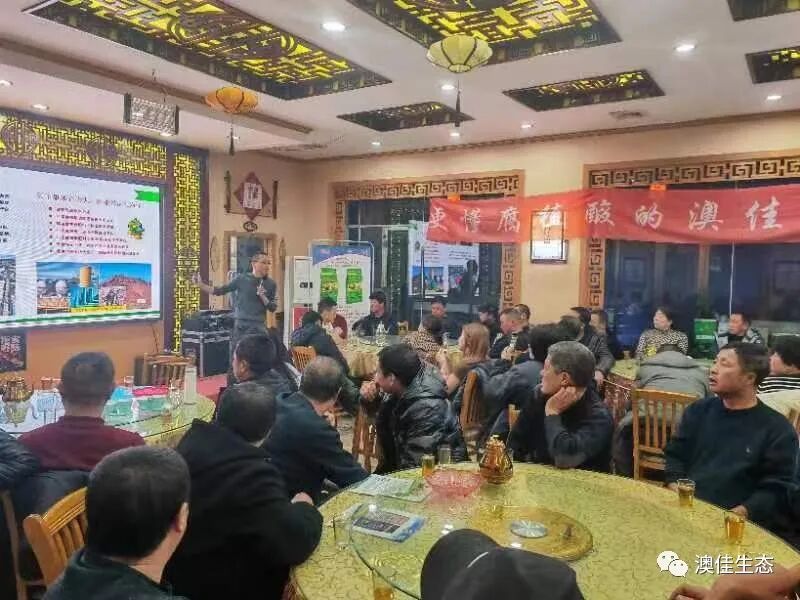 2023年12月26日晚上6点,在通辽扎鲁特黄花山镇,澳佳生态与通辽天泽农资共同举办澳佳腐植酸系列产品说明会和农户订货会,参会人数近百人,话种植,学技术,会议氛围浓烈。