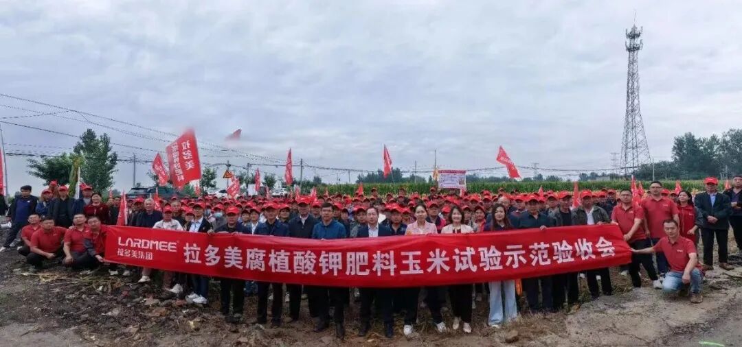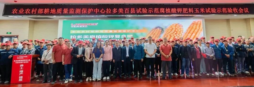 2025年9月22日上午,在庆祝第8个中国农民丰收节之际,拉多美科技集团股份有限公司(以下简称“拉多美”)“腐植酸钾复合肥玉米试验示范验收会”在山东省德州市临邑县孟寺镇后刘村成功举行。农业农村部耕保中心闫东浩处长、中国腐植酸工业协会李双副秘书长、临邑县农业农村局省土肥站土肥站站长孔少华站长、拉多美董事长王晓春、拉多美副总裁郑连芳、拉多美经销商临邑县张敏农资经营部总经理张晓敏、当地种植大户以及拉多美营销团队400余人,共同见证了这场实打实收的测产盛宴。