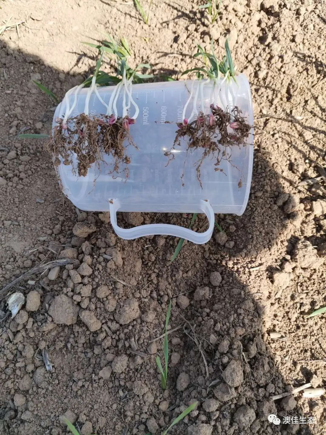 10月25日,澳佳生态农化服务人员再次回访此壤动FT小麦拌种田块,经过18个昼夜的生长,此时相比较已出现很大不同。从现场拍摄的视频中我们能清晰看到,壤动FT拌种小麦苗齐,苗壮,颜色浓绿;而旁边未拌种小麦整体望去苗黄偏弱。于是我们分别在两处各挖10株小麦,对比根系生长情况。壤动FT拌种小麦根系明显发达,根系多,带土多,而且在长势上略高一筹,叶片明显宽厚,茎秆明显粗壮。