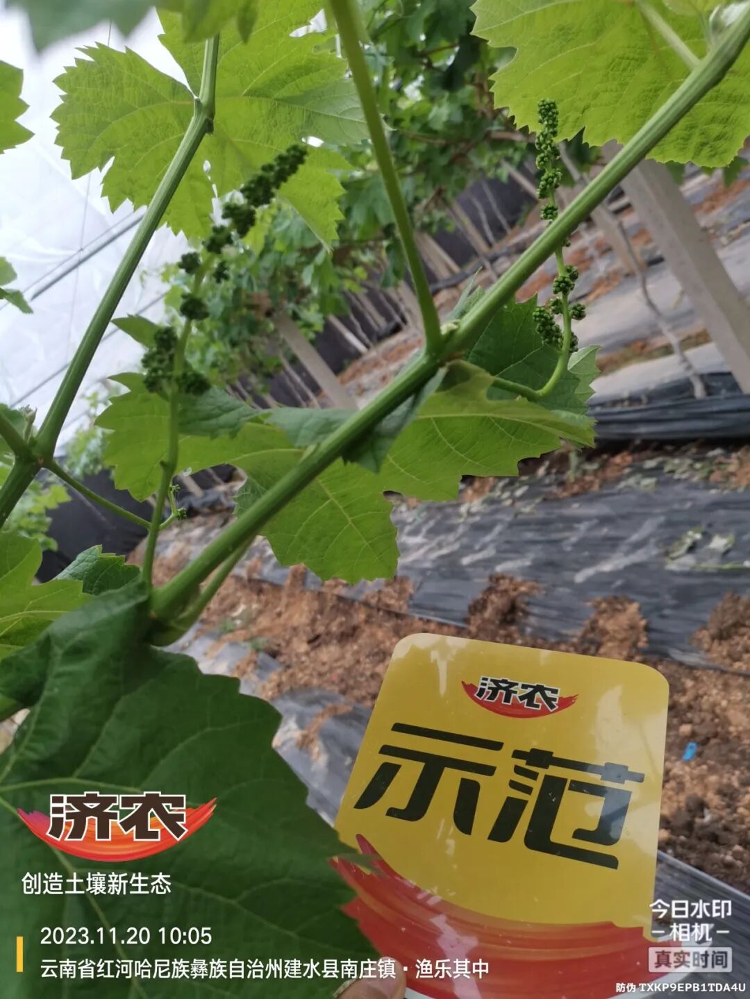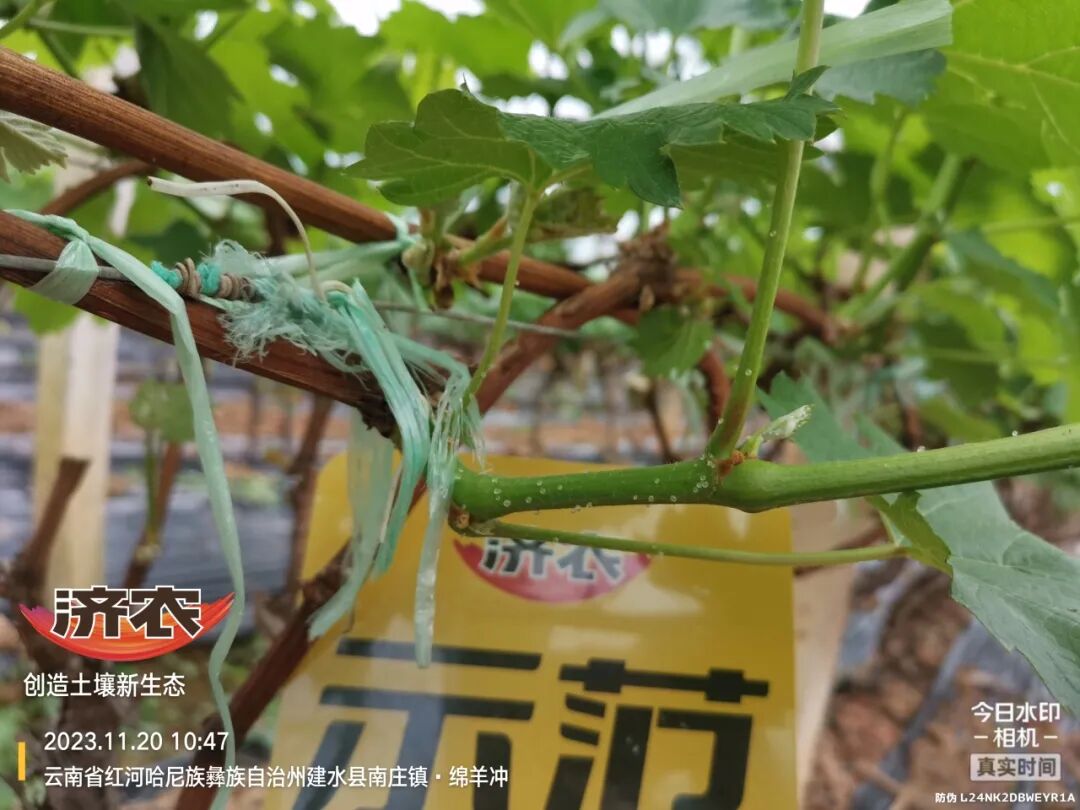 11月20日鼎天济农云南区域市场服务经理来到王老板的葡萄园回访济农种植方案使用效果,回访时葡萄处于拉花期即新梢生长期。从使用济农种植方案的效果来看,葡萄叶片油亮有光泽,新梢生长整齐,长度在30-45cm左右,花芽萌出整齐,双头花多。新梢枝头弯曲,枝条基部上有营养珠。同时从葡萄整个植株表现来看,植株根系发达,营养充足,树体长势健壮。这些都是葡萄树体健康生长的良好迹象。