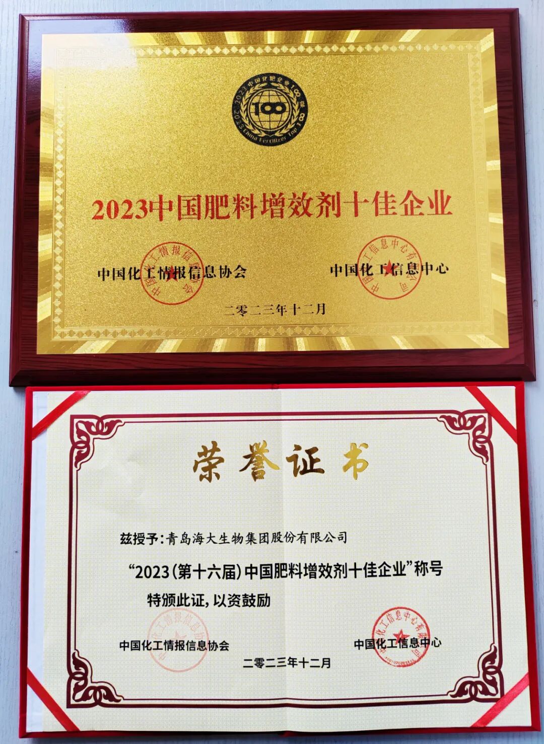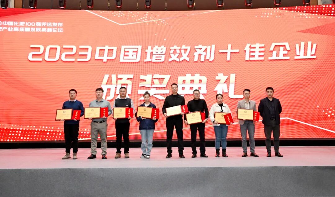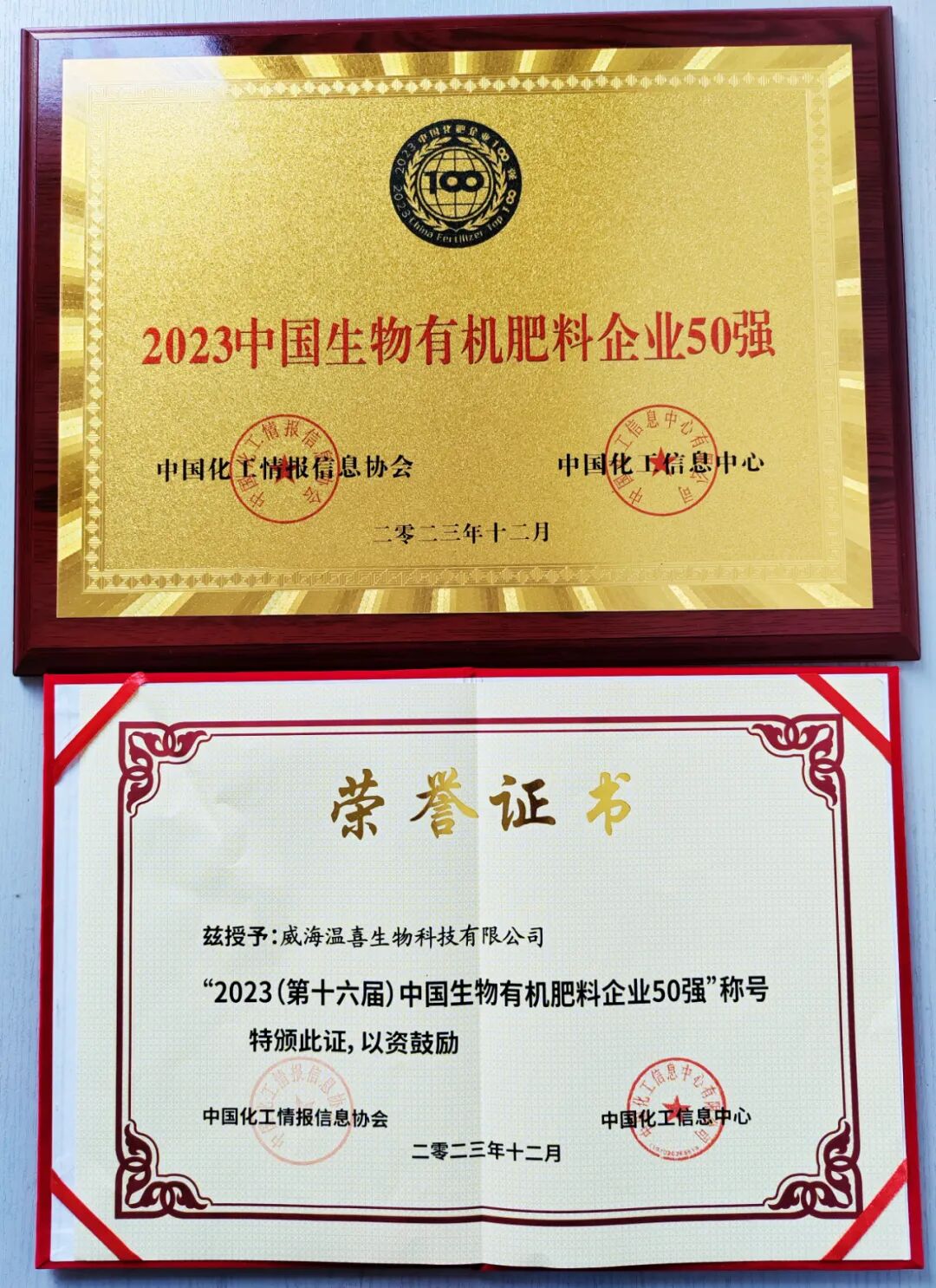 腐植酸肥料专委会新闻资讯站12月14日,由中国化工情报信息协会、中国化工信息中心、泰安市人民政府主办的“2023(第十六届)中国化肥100强评选发布暨中国化肥产业高质量发展高峰论坛”在山东省泰安市盛大召开。本次会议以“加快培育世界一流企业 助力构建高质量发展”为主题,旨在发挥一流企业榜样示范作用、聚焦于行业热点、痛点,共同探讨、推动我国化肥产业高质量发展。会上,2023中国化肥百强榜单正式发布,青岛海大生物集团股份有限公司连获三项大奖,其中集团获得:2023中国特种肥料企业50强、2023中国肥料增效剂十佳企业;子公司威海温喜生物科技有限公司获得:2023中国生物有机肥料企业50强。
