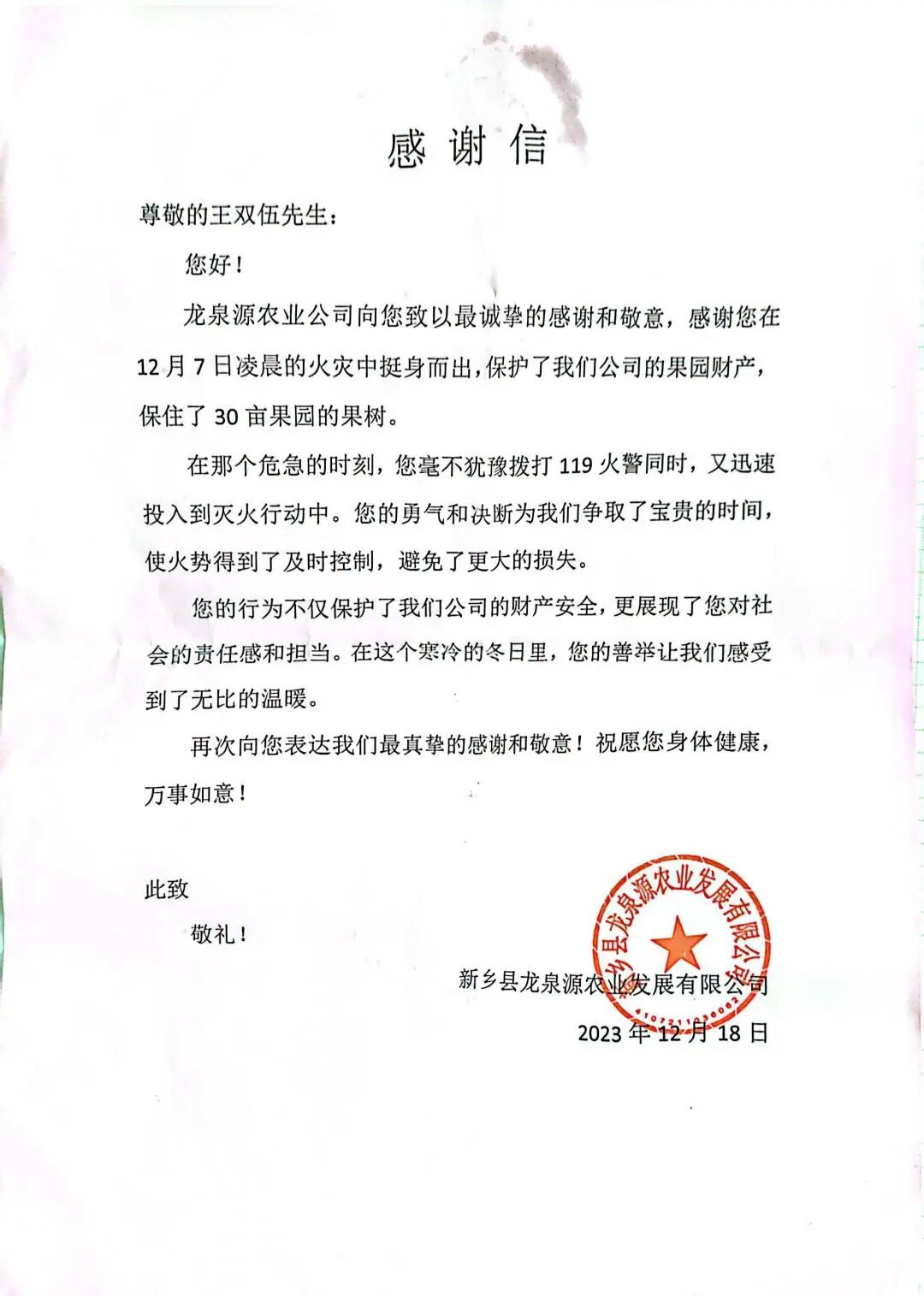 信中对心连心员工王双伍在12月7日凌晨,龙泉源果园突发火灾的危急险情,挺身救火、保护龙泉果园果树安全的行动表示由衷感谢。这是心连心人践行诚信文化的又一典范,为广大员工树立起榜样。